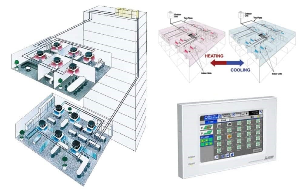 يتكون من وحدة خارجية واحدة يمكن توصيلها بعدة وحدات داخليه يمكن ان يصل عددها الي 50 وحدة داخلية , ويمكن للوحدات الداخليه ان تتعدد وتختلف بين ( وحدة مخفيه او اسبيلت حائطية او كاسيت سقفيه ) , أما نظام التكييف العادي او التكييف المركزي يحتاج الى وحدة خارجية لكل وحده داخلية متصلة بالمنزل أو المشروع , بمعنى اذا عندى 10 غرف ب 10 وحدات داخلية ستحتاج لتركيب 10 وحدات خارجية